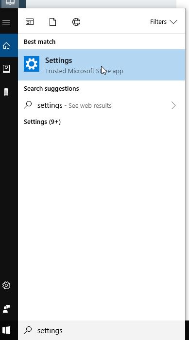 In the search box type Settings, then click on the Settings app. Or, Right-Click on the Windows Start button and select Settings.