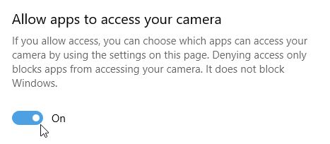 - In the Privacy Screen click on Camera in the left column. Then under Allow apps to access your camera make sure it is turned On.